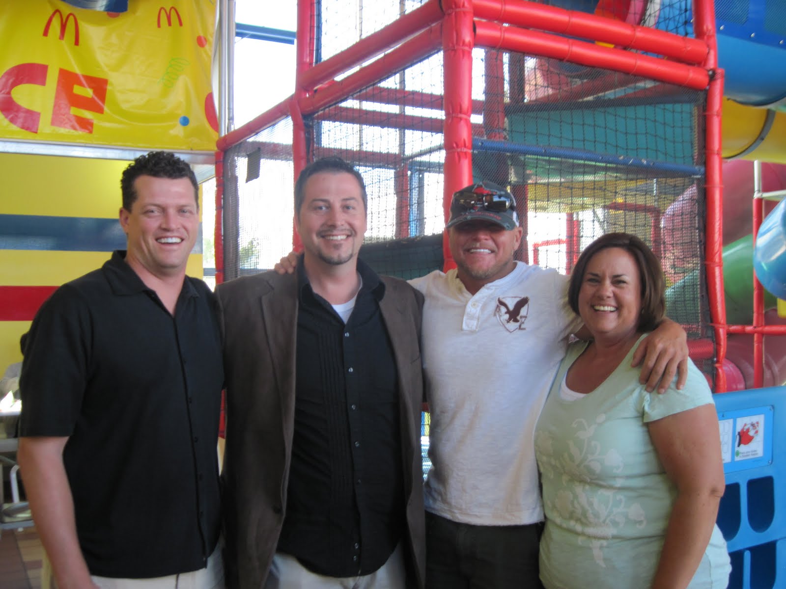 (Angie's parents owned the Cow Palace Lanes...bowling alley) Paul was my first grade school crush, and Brooks and I were nominated Biggest Flirts our Senior Year.Paul, Roger, Brooks, & I all met up at McDonald's the next morning by surprise. Whitney & I were at the drive-up about to order when we heard this sexy, masculine voice coming from the speaker saying, "You can have anything you want, honey!" Out jumped Brooks and Paul from behind. We about wet our pants laughing so hard. We all visited for a few more hours. It was so fun hearing of their lives since high school and remembering fun childhood memories.